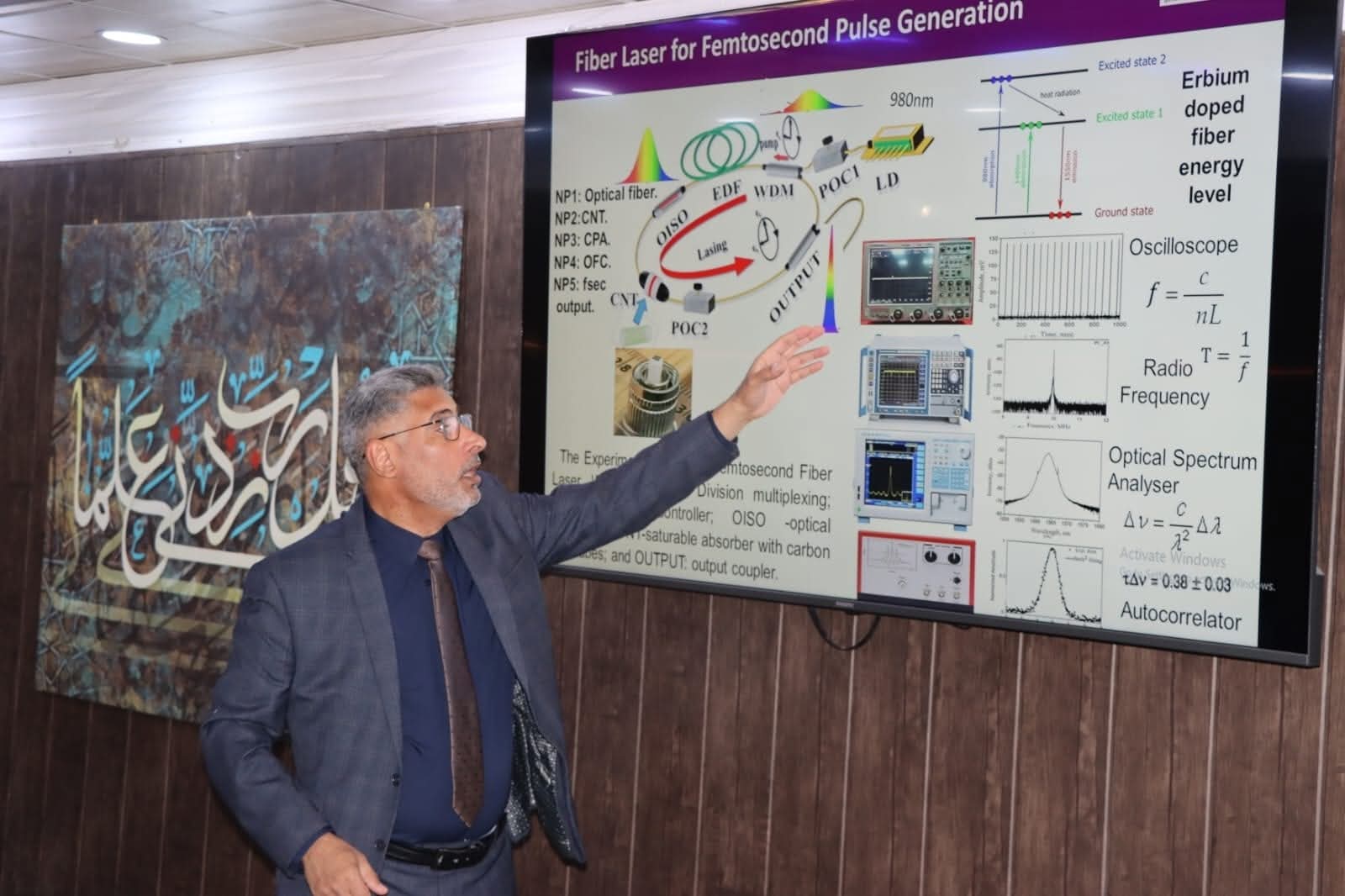 قدّم الورشة التدريسي في جامعة أستون البريطانية، الدكتور هاني جاسم كباشي، وتناول خلالها أحدث تقنيات ليزرات الألياف الضوئية ( الفمتوثانية )، وآليات تصميمها، واستراتيجيات تطويرها، إضافة إلى التطبيقات العلمية والصناعية المتقدمة التي تستخدم فيها.