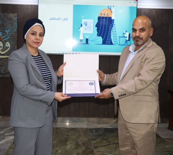 وفي ختام الورشة، قدّم رئيس فرع التطبيقات الطبية والبايلوجية أ.د فاضل محمد لفتة شهادة تقديرية إلى المحاضِرة، نيابةً عن السيد عميد المعهد، تقديراً لجهودها المتميزة في إثراء المحتوى العلمي وخدمة الباحثين.