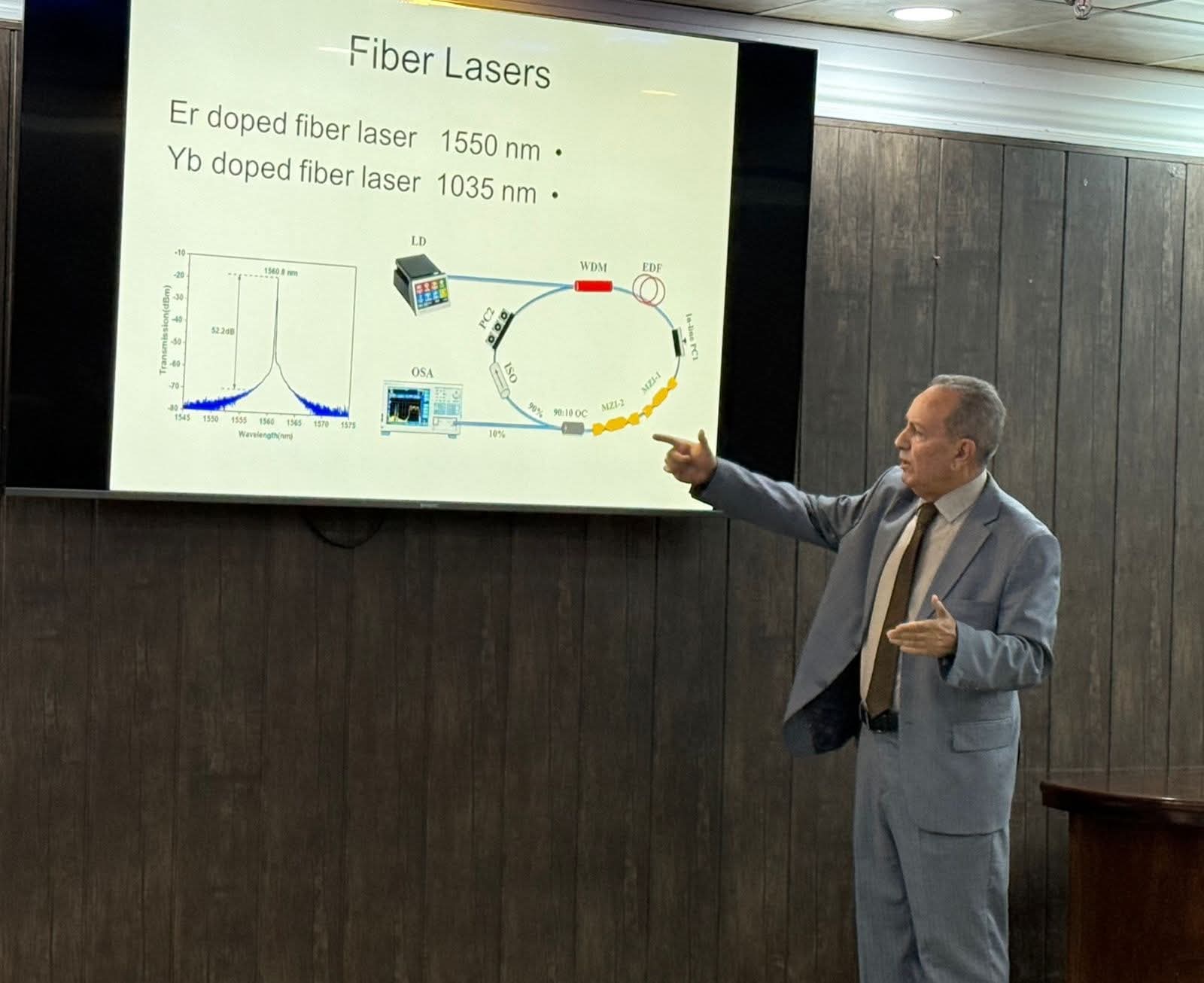 حيث تم خلالها استعراض للمسيرة العلمية للأستاذ الدكتور عبد الهادي الجنابي وقصة نجاحه في مجال بناء منظومات ليزر الليف الضوئية ومتحسسات الألياف الضوئية